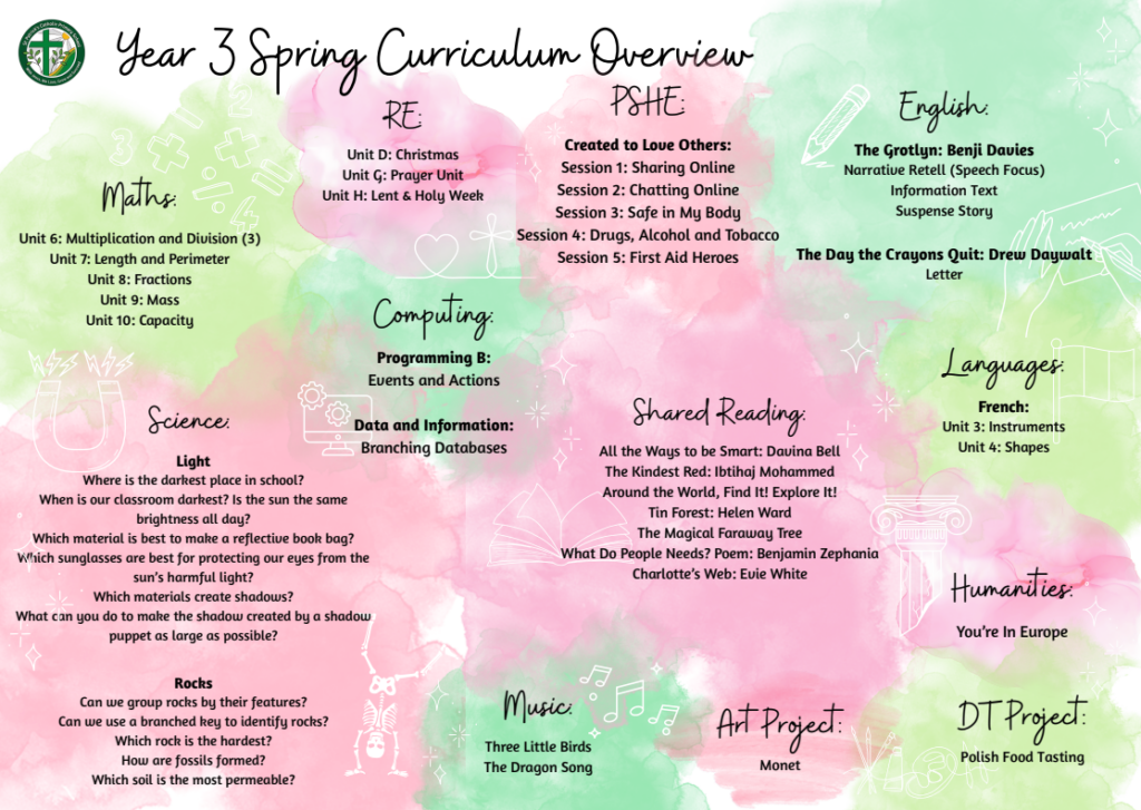 It is also an exciting and special time in the children’s faith journey as we prepare together for the sacrament of First Holy Communion. Alongside this, we have lots to look forward to this year, including an inspiring trip to Cadbury World to support our reading of Charlie and the Chocolate Factory, and a visit to the National Stone Centre to explore and investigate rocks. These experiences will help bring our topics to life and give children memorable opportunities to connect their learning to the world around them.